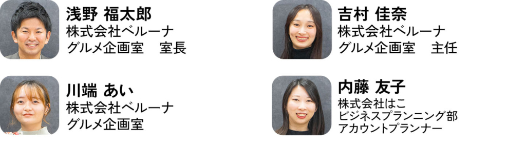本記事では、ベルーナグルメの浅野氏・吉村氏・川端氏、はこ 内藤との座談会の模様をお届けします。